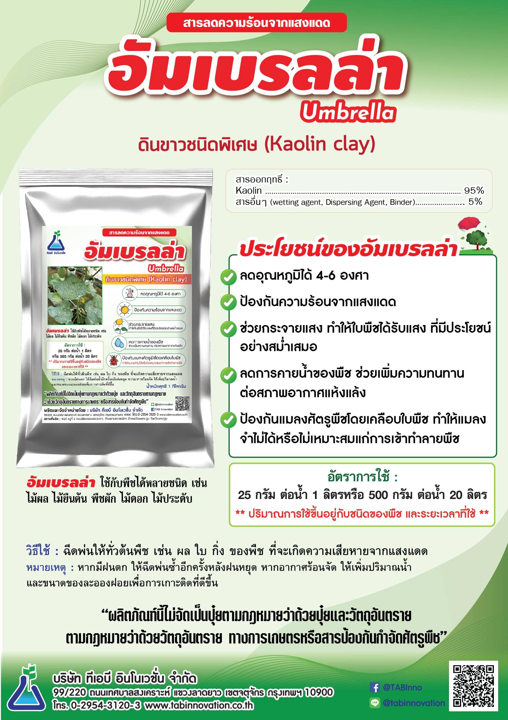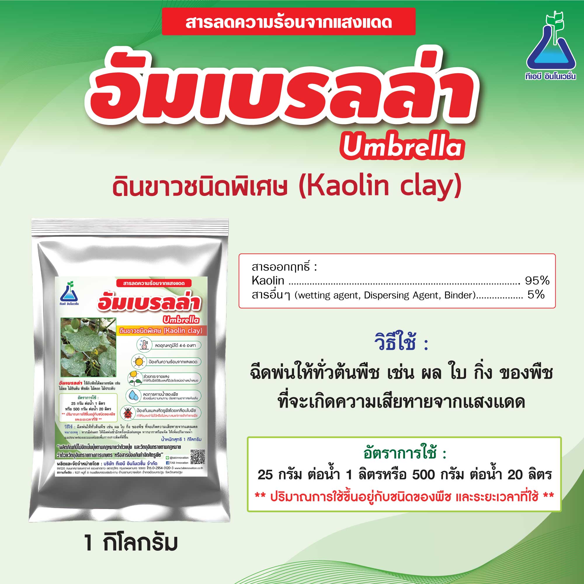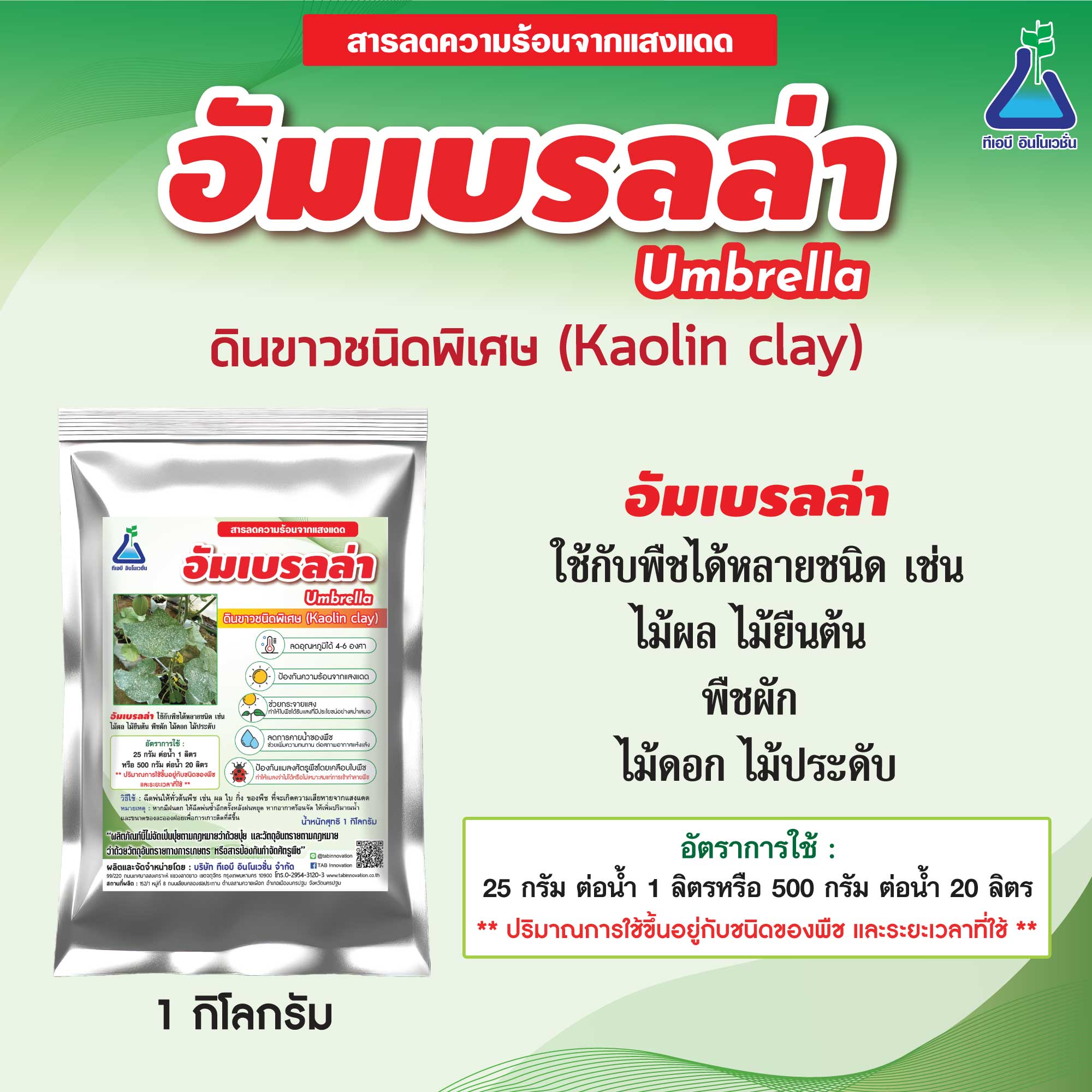 อัมเบรลล่า คือ Kaolin Clay อนุภาคขนาดเล็ก เป็นสารแขวนลอยในน้ำอยู่ในรูปผงละเอียด เมื่อฉีดพ่นในแปลงพืชสามารถติดใบพืชได้ดี