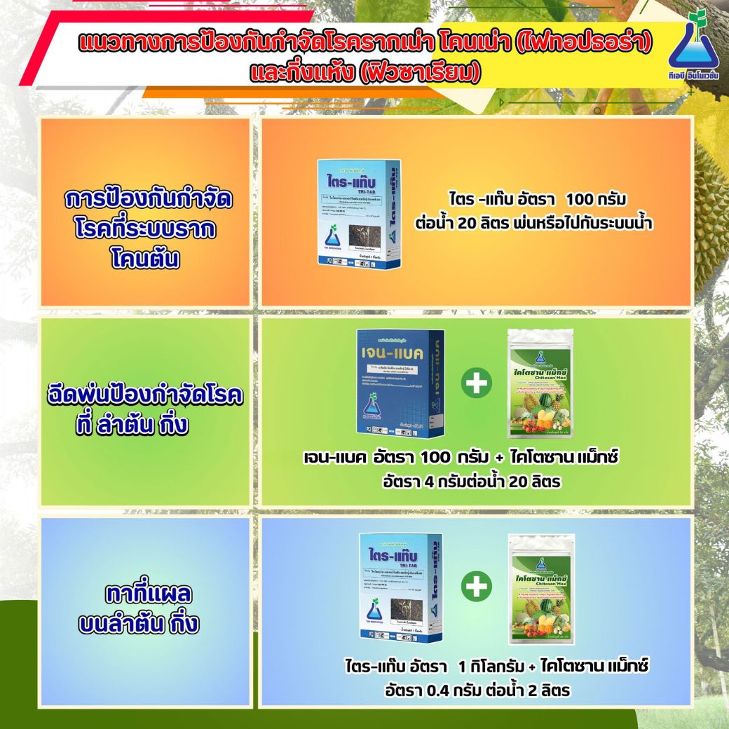 ทาที่แผลบนลำต้น กิ่ง : ไตร-แท๊บ อัตรา 1 กิโลกรัม + ไคโตซาน แม็กซ์ อัตรา 0.4 กรัม ต่อน้ำ 2 ลิตร (ผสมไคโตซาน แม็กซ์ ลงน้ำก่อน)