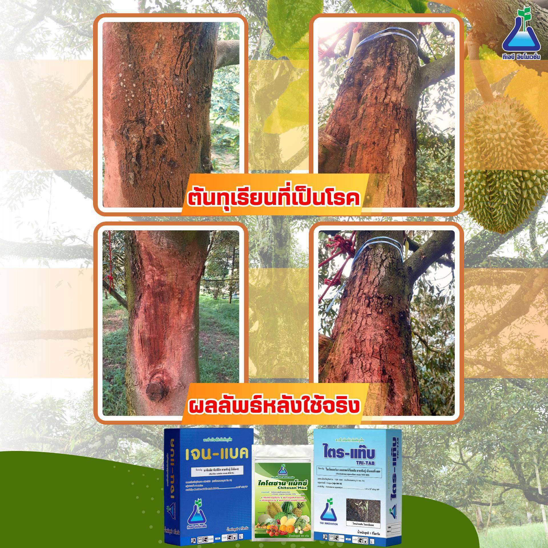 อาการต้นทุเรียนที่เป็นโรค และผลลัพธ์หลังจากใช้ชีวภัณฑ์ เจน-แบค (บาซิลลัส ซับทิลิส สายพันธุ์ บีเอ็ม-01) ไตร-แท๊บ (ไตรโคเดอร์มา แอสเพอร์เรียลลัม สายพันธุ์ เอ็นเอสที-009) และ ไคโตซาน แม็กซ์