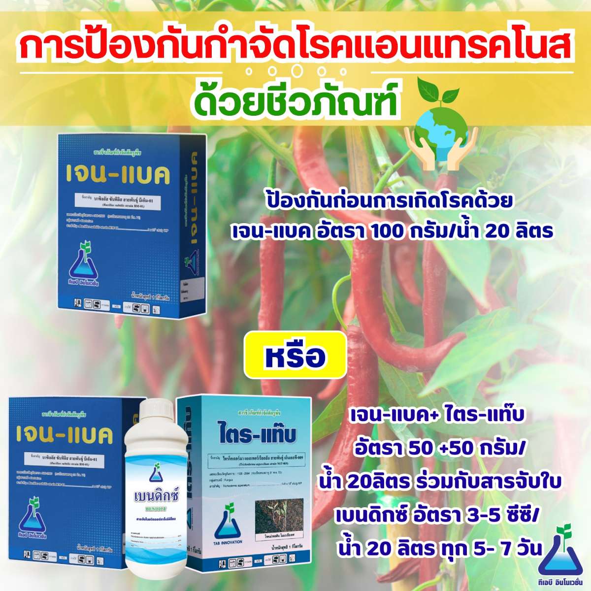 3. ป้องกันก่อนการเกิดโรคด้วย เจน-แบค อัตรา 100 กรัม ต่อน้ำ 20 ลิตร หรือ เจน-แบค อัตรา 50 กรัม + ไตร-แท๊บ อัตรา 50 กรัม + สารจับใบเบนดิกซ์ อัตรา 3-5 ซีซี ต่อน้ำ 20 ลิตร ทุก 5-7 วัน
