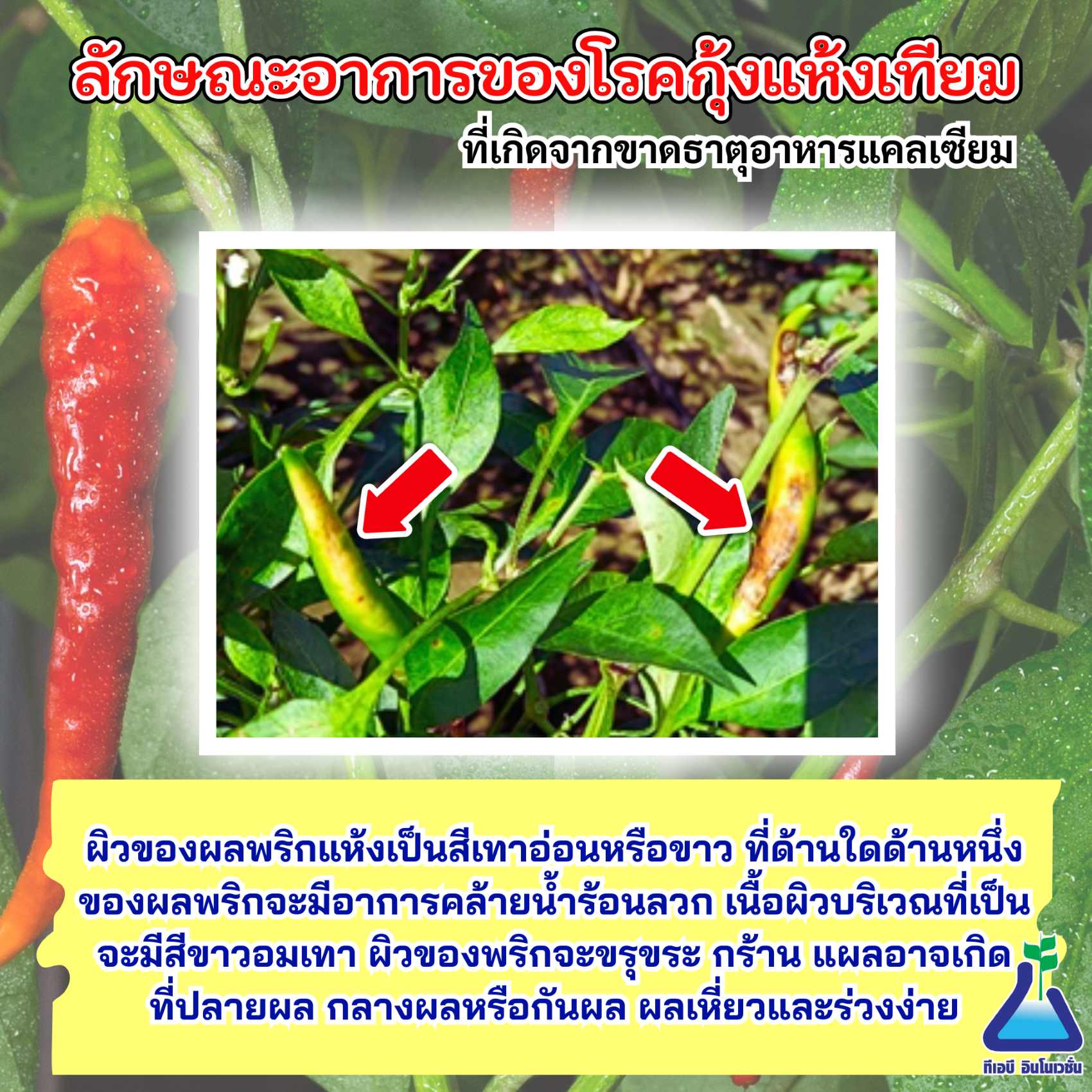 4. เนื่องจากอาการโรคกุ้งแห้งเทียมจะทำให้ผนังเซลล์พริกไม่แข็งแรง เพื่อป้องกันโรคแอนแทรคโนสเข้าทำลายซ้ำ แนะนำให้ฉีดพ่น เจน-แบค อัตรา 100 กรัม ต่อน้ำ 20 ลิตร
