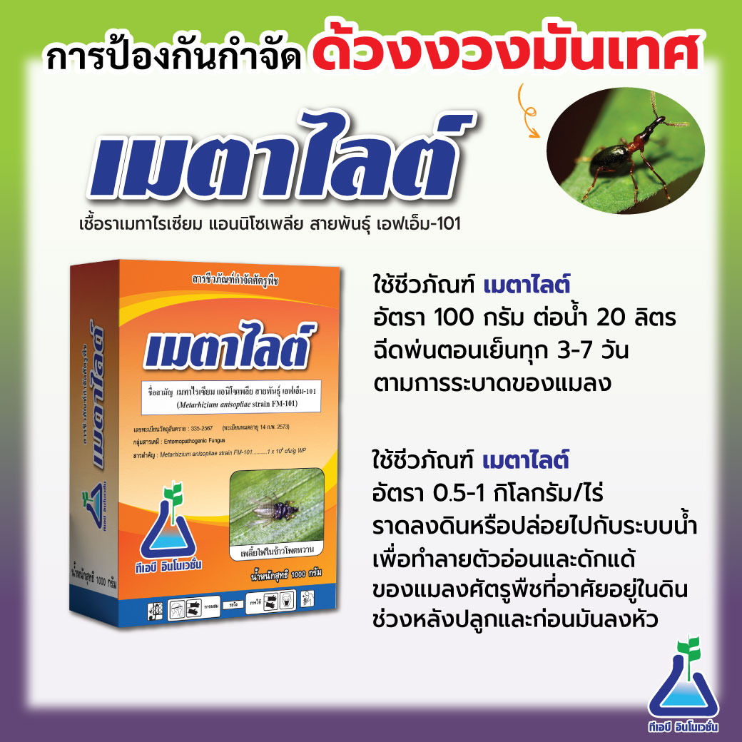 ชีวภัณฑ์: พ่น/ราดดิน ผสมเมตาไลต์ในอัตรา 100 กรัม ต่อน้ำ 20 ลิตร ฉีดพ่นตอนเย็นทุก 3-7 วัน ตามการระบาดของแมลง ผสมเมตาไลต์ ในอัตรา 0.5 -1 กิโลกรัม/ไร่ ราดลงดินหรือปล่อยไปกับระบบน้ำ เพื่อทำลายตัวอ่อนและดักแด้ของแมลงศัตรูพืชที่อาศัยอยู่ในดิน ช่วงหลังปลูกและก่อนมันลงหัว