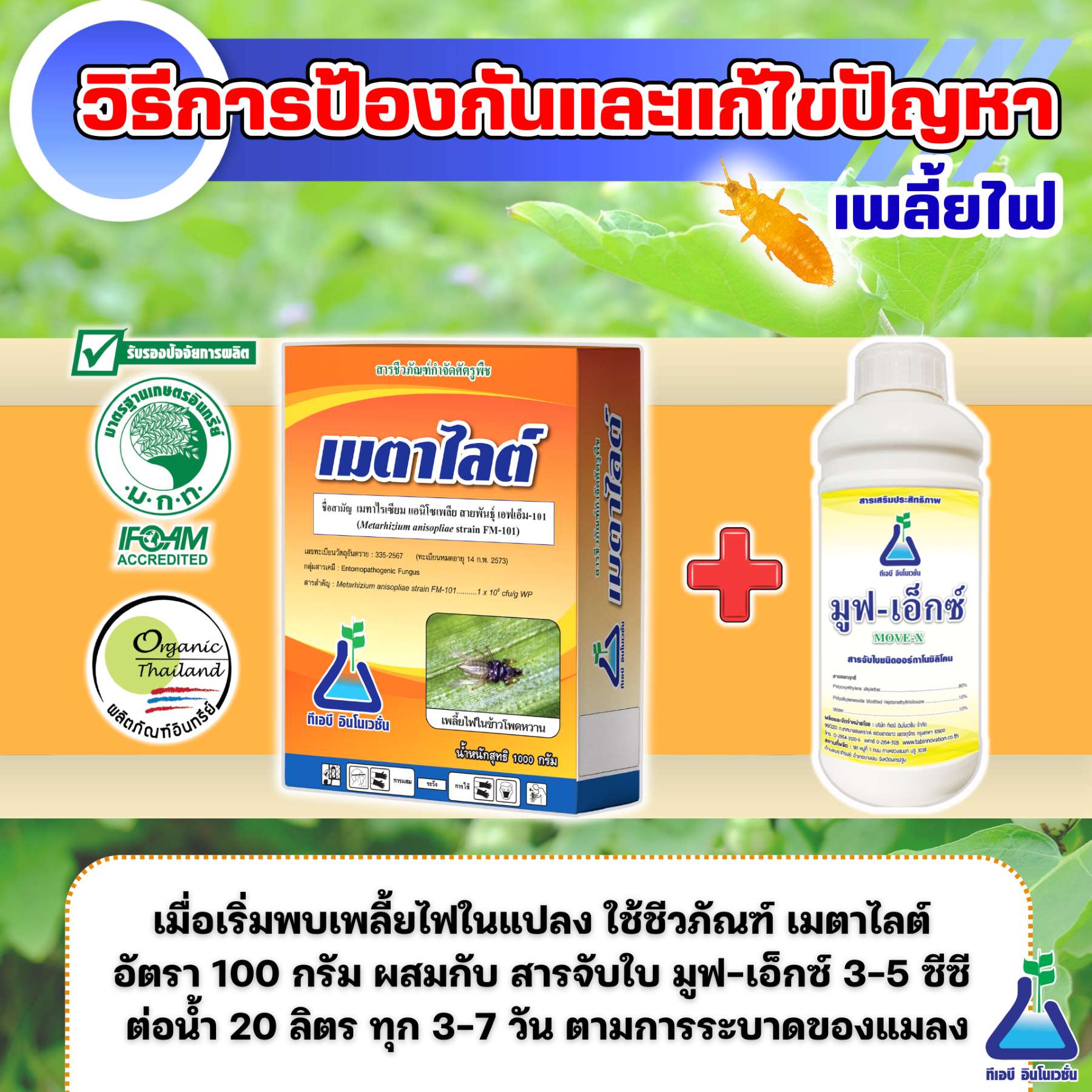 5. เมื่อเริ่มพบเพลี้ยไฟในแปลง ใช้ชีวภัณฑ์ เมตาไลต์ อัตรา 100 กรัม ผสมกับ สารจับใบ มูฟ-เอ็กซ์ 3-5 ซีซี ต่อน้ำ 20 ลิตร ทุก 3-7 วัน ตามการระบาดของแมลง