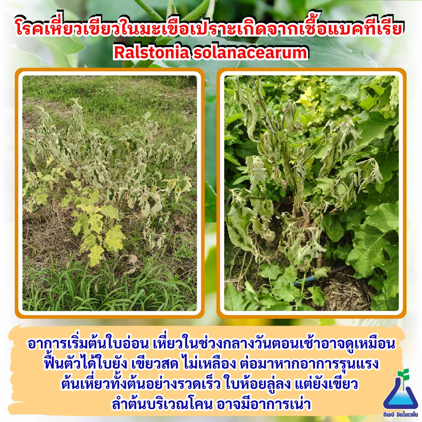 คำตอบ : ต้นมะเขือเปราะมีอาการของโรคเหี่ยวเขียวซึ่งเกิดจากแบคทีเรีย Ralstonia solanacearum ซึ่งเมื่อปล่อยให้เวลาผ่านไปอาการจะยิ่งรุนแรงและแพร่ระบาดไปในแปลงได้อย่างรวดเร็ว สามารถแพ่ระบาดผ่านทางน้ำ ดิน เครื่องมือทางการเกษตร pH ดินที่เหมาะกับการเกิดโรค รากที่สัมผัสกันหรือรากเป็นแผล ดังนั้นควรรีบป้องกันและกำจัดออกจากแปลงโดยเร็ว