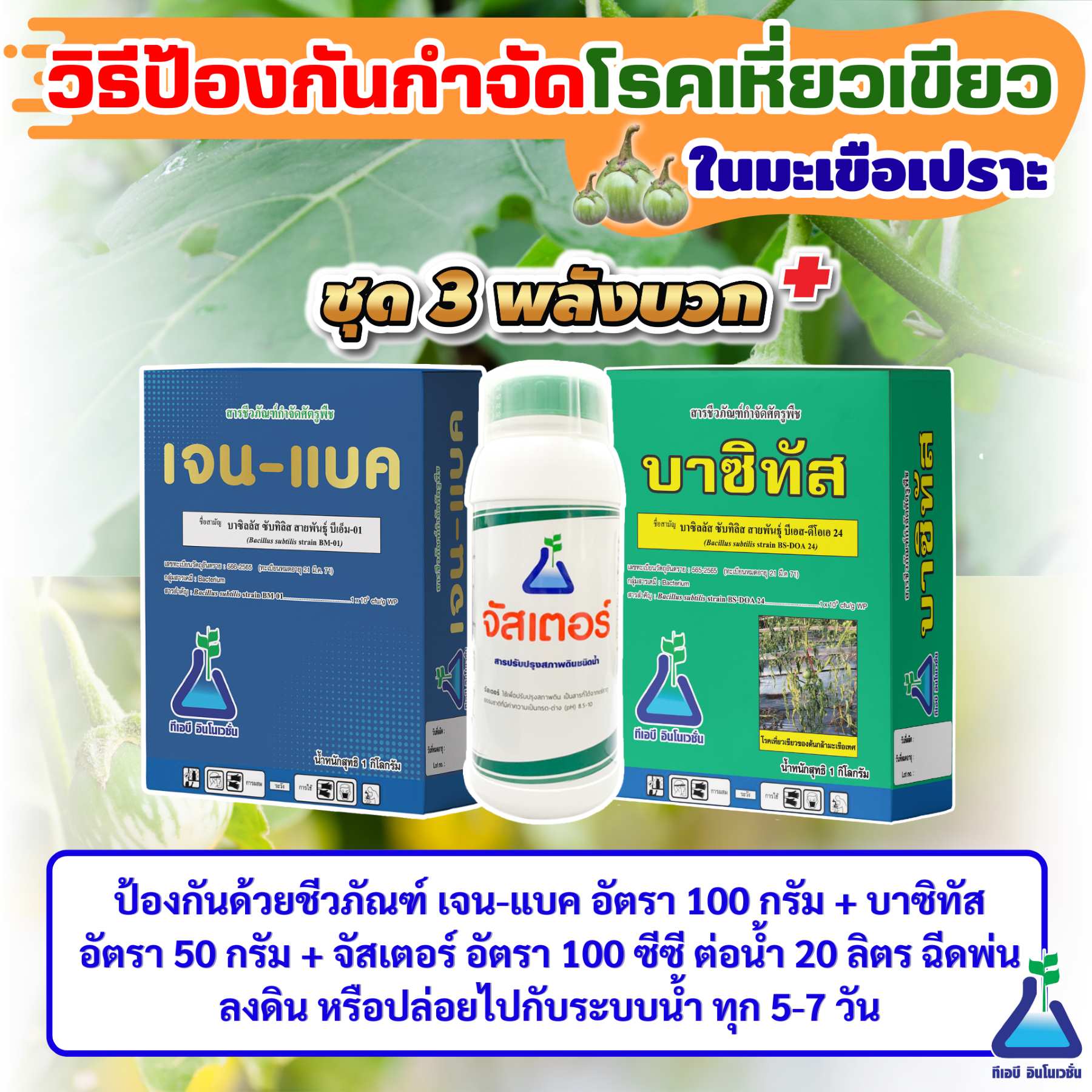 4. จบปัญหาเหี่ยวเขียวและป้องกันด้วยชุด 3 พลังบวก มีชีวภัณฑ์ เจน-แบค อัตรา 100 กรัม + บาซิทัส อัตรา 50 กรัม + จัสเตอร์ อัตรา 100 ซีซี ต่อน้ำ 20 ลิตร ฉีดพ่นลงดิน หรือปล่อยไปกับระบบน้ำ ทุก 5-7 วันตามการระบาดของโรค
