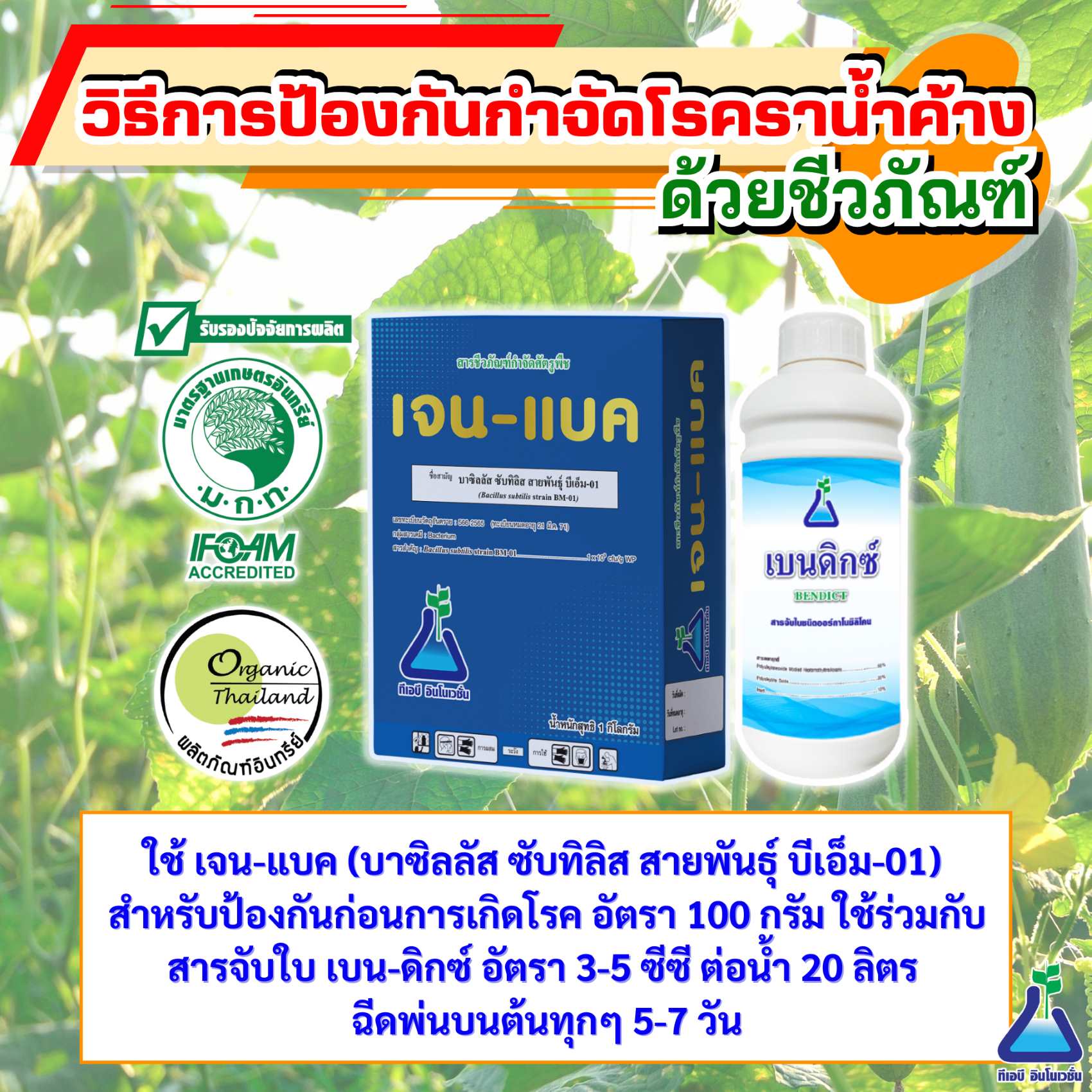 3. ใช้ เจน-แบค (บาซิลลัส ซับทิลิส สายพันธุ์ บีเอ็ม-01) สำหรับป้องกันก่อนการเกิดโรค อัตรา 100 กรัม ใช้ร่วมกับสารจับใบ เบน-ดิกซ์ อัตรา 3-5 ซีซี ต่อน้ำ 20 ลิตร ฉีดพ่นบนต้นทุกๆ 5-7 วัน หากพบการระบาดสามารถใช้ร่วมกับสารเคมีตามที่หน่วยราชการแนะนำ เช่น เมทาแลกซิล 25% WP หรือ แมนโคเซบ 80% WP โดยพ่นให้ทั่วทั้งด้านบนใบและใต้ใบ