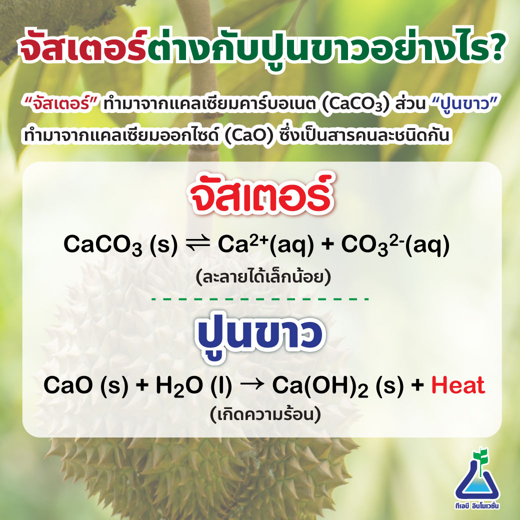 “จัสเตอร์” ทำมาจากแคลเซียมคาร์บอเนต (CaCO3) ส่วน “ปูนขาว” ทำมาจากแคลเซียมออกไซด์ (CaO) ซึ่งเป็นสารคนละชนิดกัน การจะเกิดความร้อนได้นั้น เราจะต้องรู้ถึงปฏิกิริยาที่เกิดขึ้น