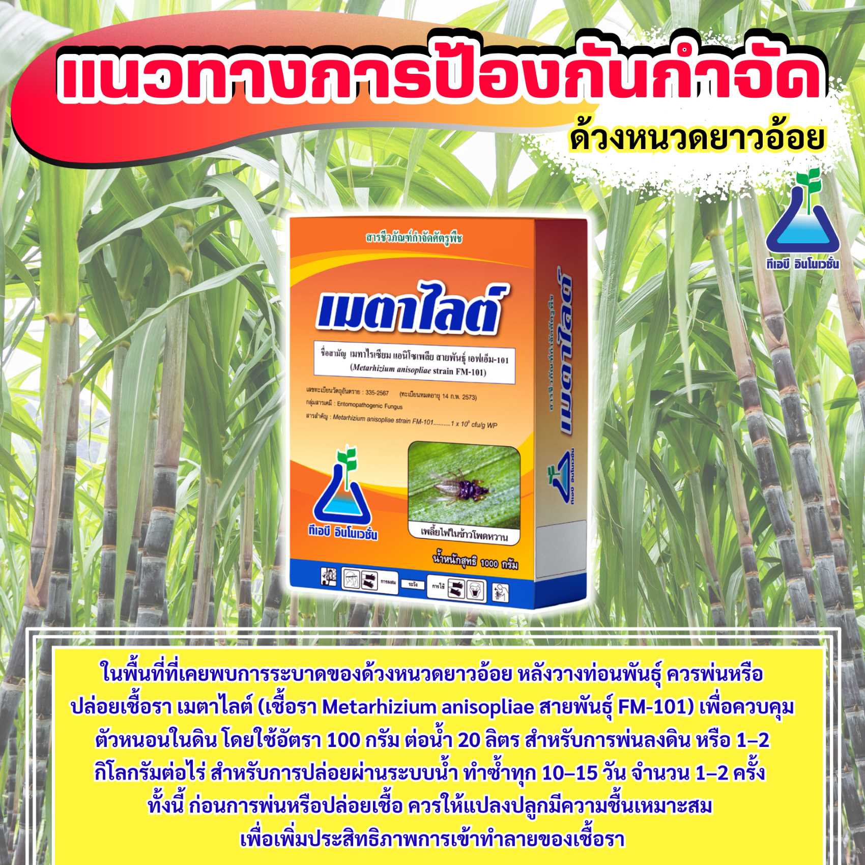 3. ในพื้นที่ที่เคยพบการระบาดของด้วงหนวดยาวอ้อย หลังวางท่อนพันธุ์ ควรพ่นหรือปล่อยเชื้อรา เมตาไลต์ (เชื้อรา Metarhizium anisopliae สายพันธุ์ FM-101) เพื่อควบคุมตัวหนอนในดิน โดยใช้อัตรา 100 กรัม ต่อน้ำ 20 ลิตร สำหรับการพ่นลงดิน หรือ 1-2 กิโลกรัมต่อไร่ สำหรับการปล่อยผ่านระบบน้ำ ทำซ้ำทุก 10-15 วัน จำนวน 1-2 ครั้ง ทั้งนี้ ก่อนการพ่นหรือปล่อยเชื้อ ควรให้แปลงปลูกมีความชื้นเหมาะสม เพื่อเพิ่มประสิทธิภาพการเข้าทำลายของเชื้อรา