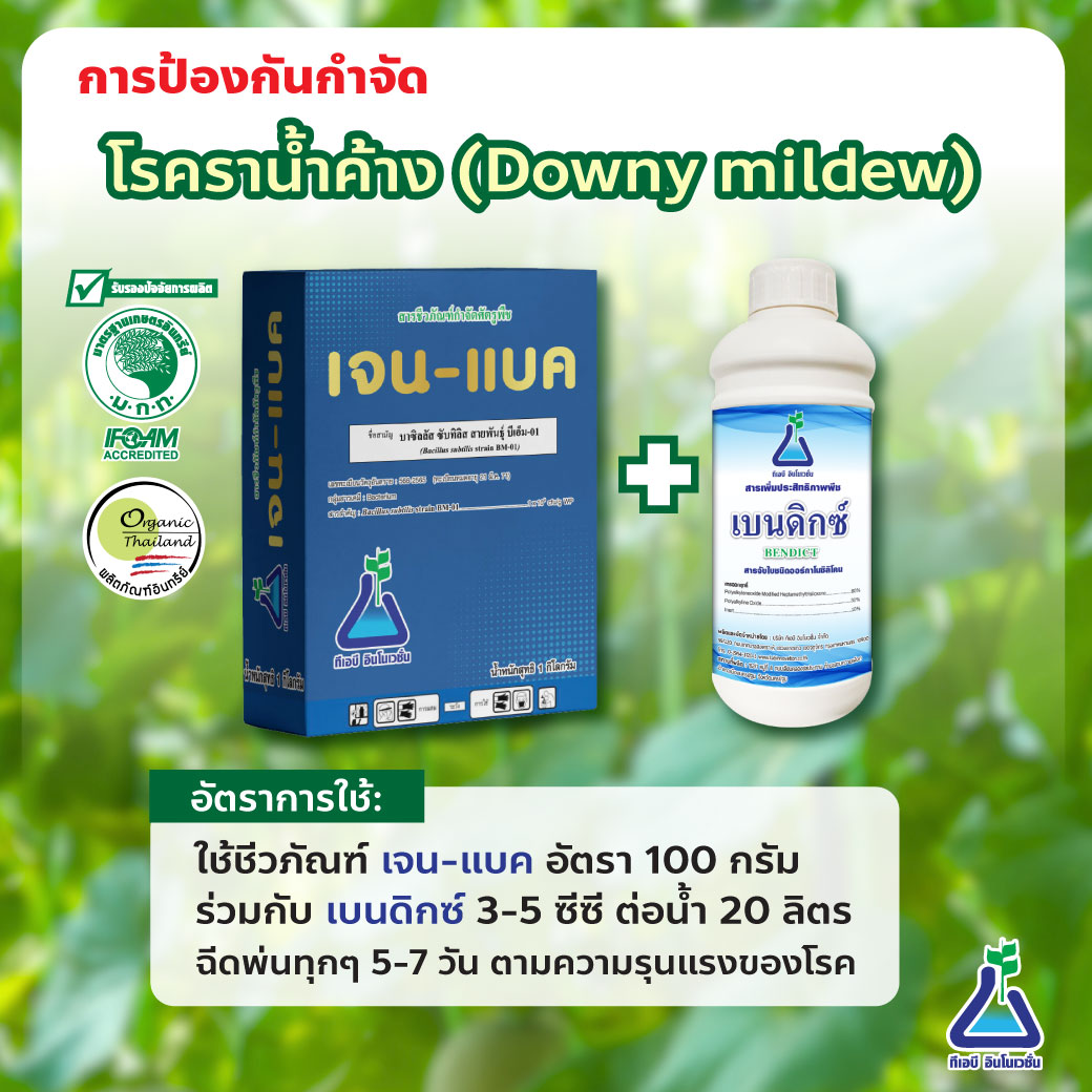 อัตราการใช้เจน-แบคในการป้องกันกำจัดโรคราน้ำค้าง เจน-แบค 100 กรัม ร่วมกับ เบนดิกซ์ 3-5 ซีซี ต่อน้ำ 20 ลิตร ฉีดพ่นทุกๆ 5-7 วัน ตามความรุนแรงของโรค