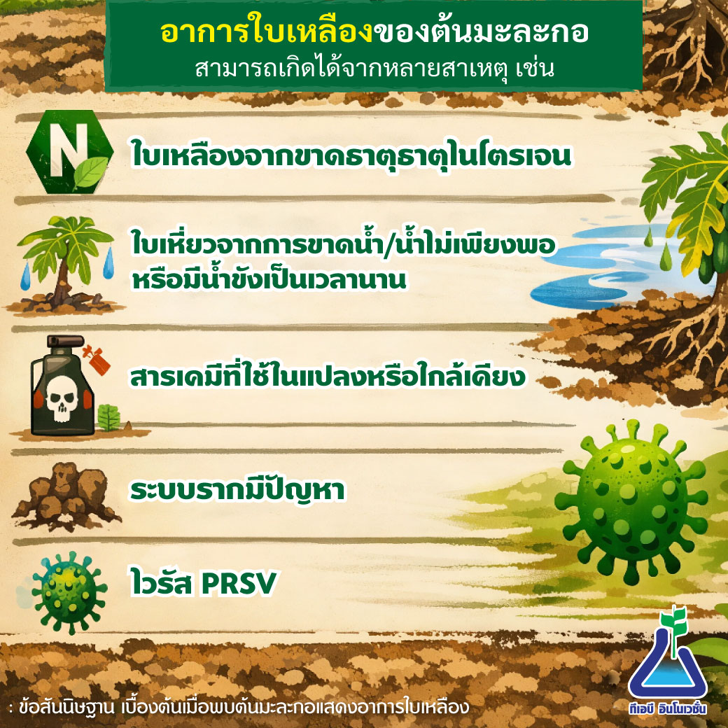 ต้นมะละกอที่แสดงอาการใบเหลืองนั้น มีด้วยกันหลายสาเหตุ ตัวอย่างเช่น
