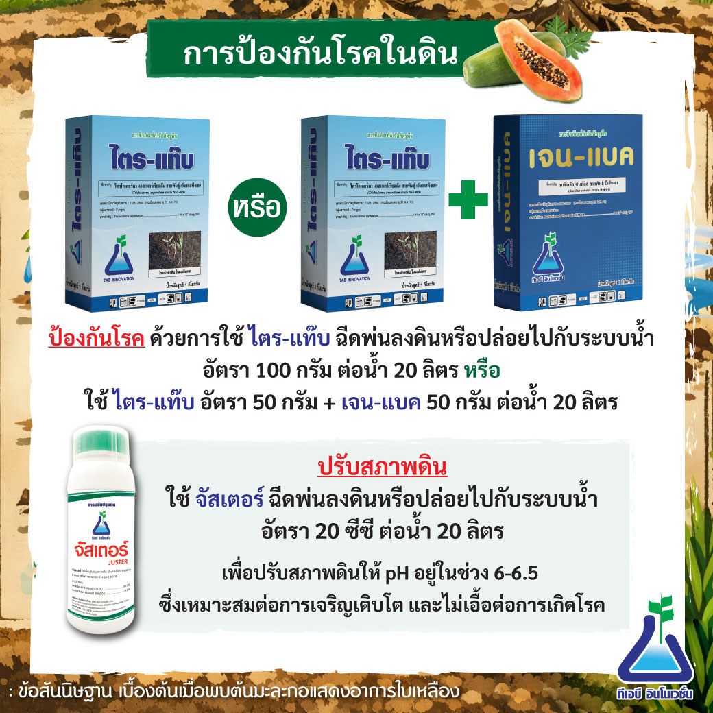 4. ป้องกันโรคด้วยการใช้ ไตร-แท๊บ ฉีดพ่นลงดินหรือปล่อยไปกับระบบน้ำ ในอัตราส่วน 100 กรัม ต่อน้ำ 20 ลิตร หรือไตร-แท๊บ 50 กรัม ร่วมกับ เจน-แบค 50 กรัม ต่อน้ำ 20 ลิตร