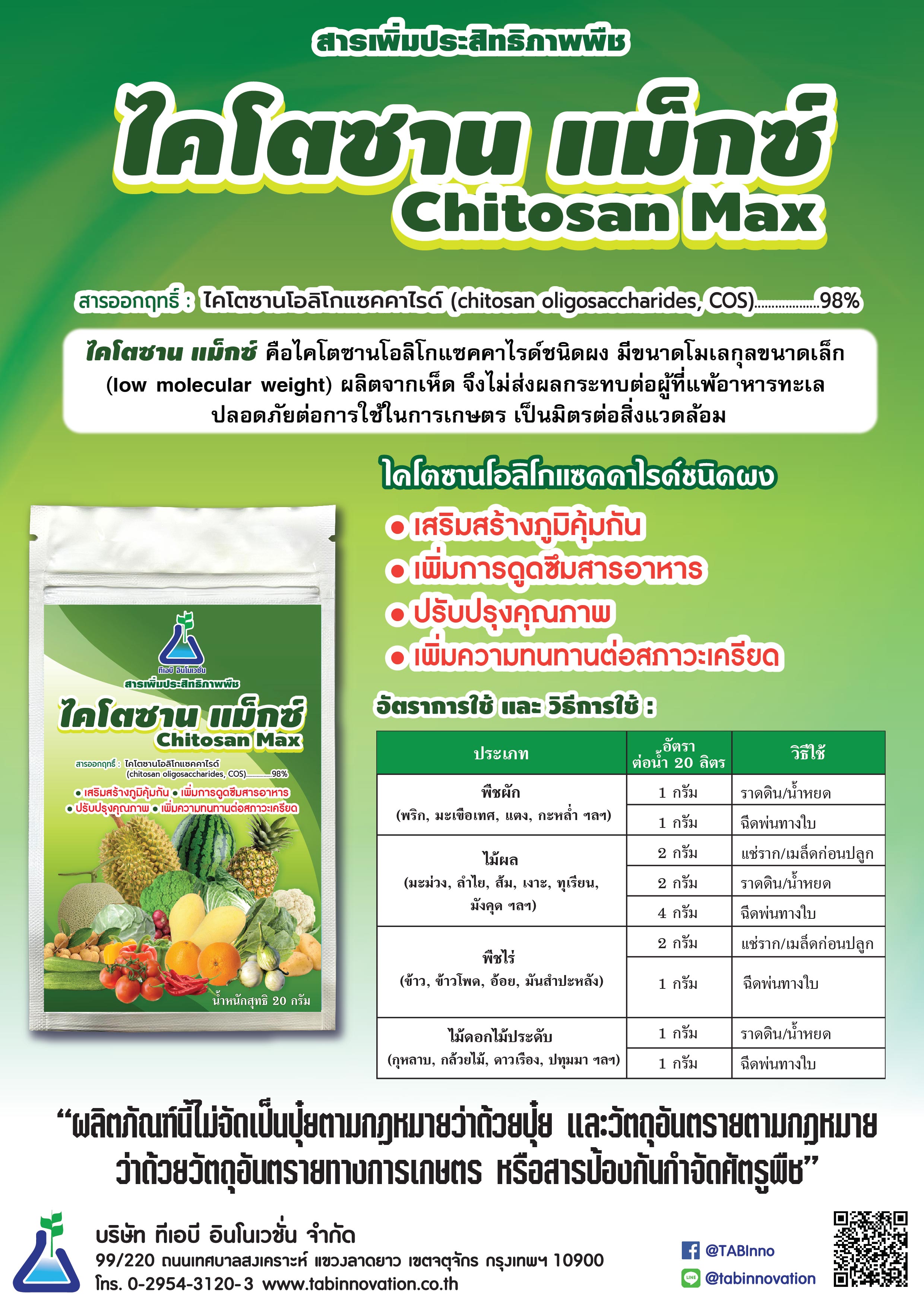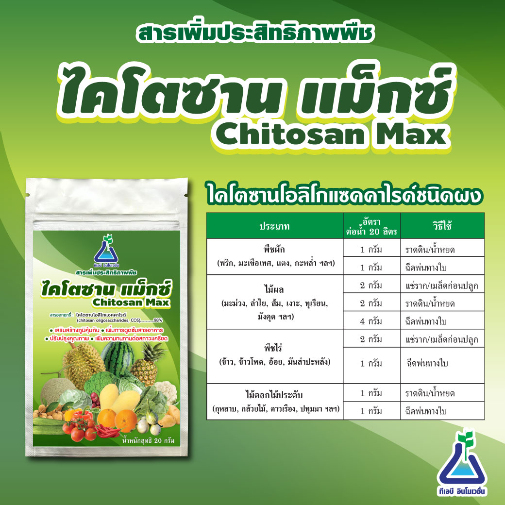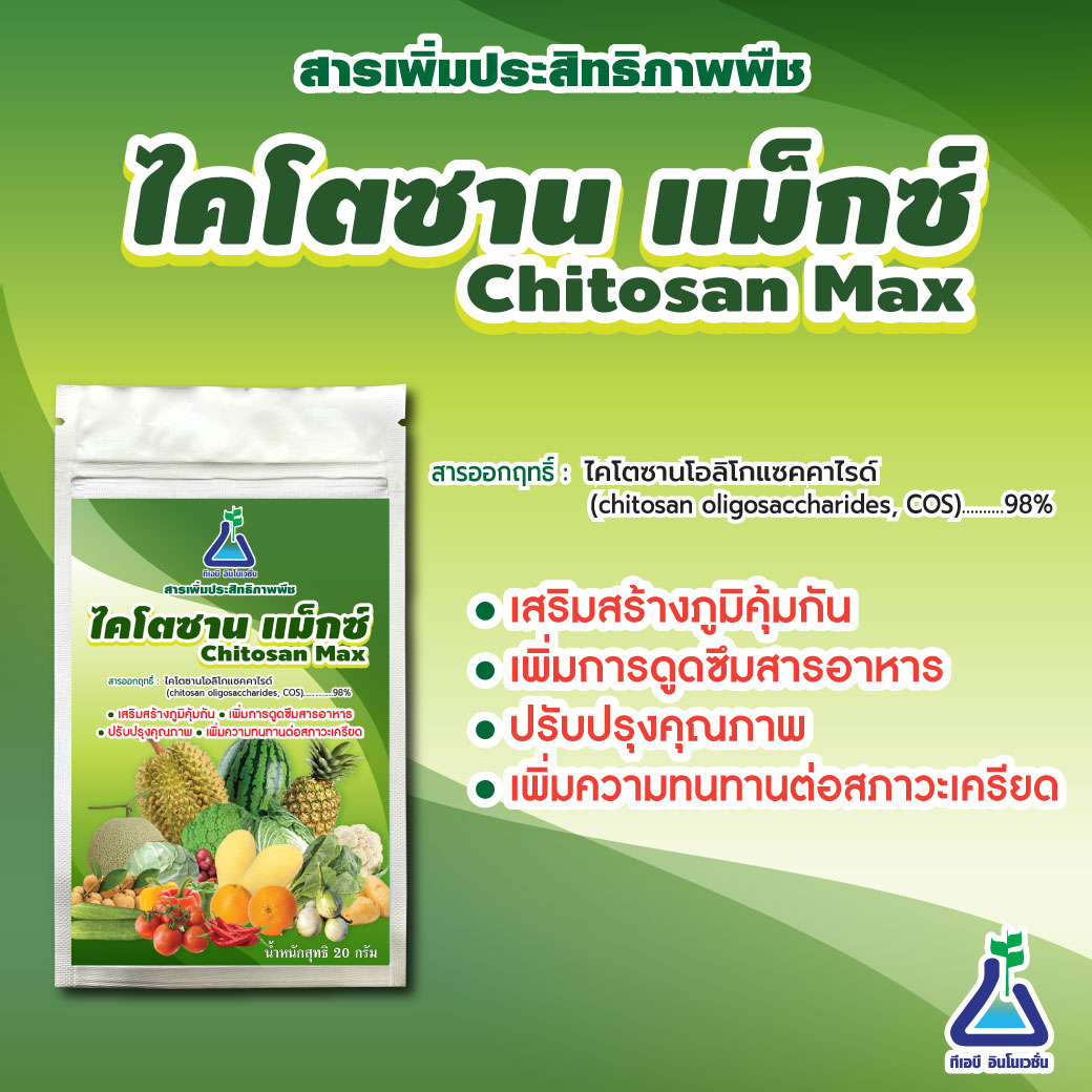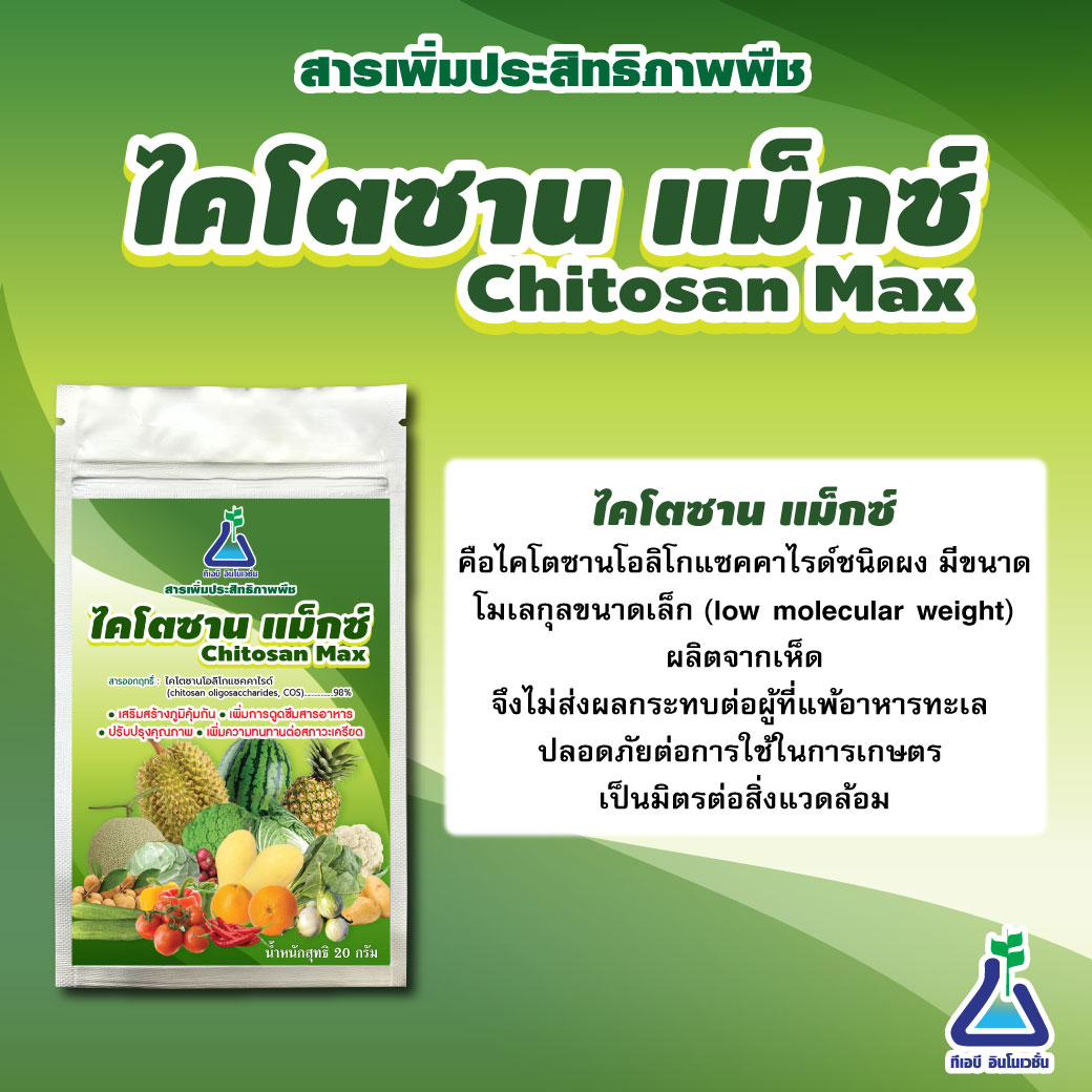 ไคโตซาน แม็กซ์ คือ ไคโตซานโอลิโกแซคคาไรด์ชนิดผง มีขนาดโมเลกุลขนาดเล็ก (low molecular weight) ผลิตจากเห็ด จึงไม่ส่งผลกระทบต่อผู้ที่แพ้อาหารทะเล ปลอดภัยต่อการใช้ในการเกษตร เป็นมิตรต่อสิ่งแวดล้อม